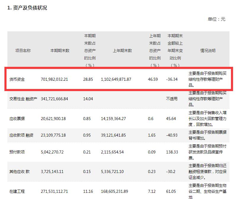 货币资金方面,本期期末数货币资金7.02亿元,2020年期末货币资金为11.03亿,同比下降36.34%,科兴制药称主要是由于报告期购买结构性存款等理财产品。