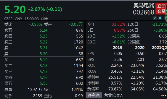 公开资料显示,广东奥马电器股份有限公司,成立于2002年11月,经营范围包括生产和销售各类家用电器、小家电产品、厨卫用具以及各类家用电器零配件等。二级市场上,截至8月17日下午收盘,奥马电器股价较上一交易日跌2.07%,报5.2元。