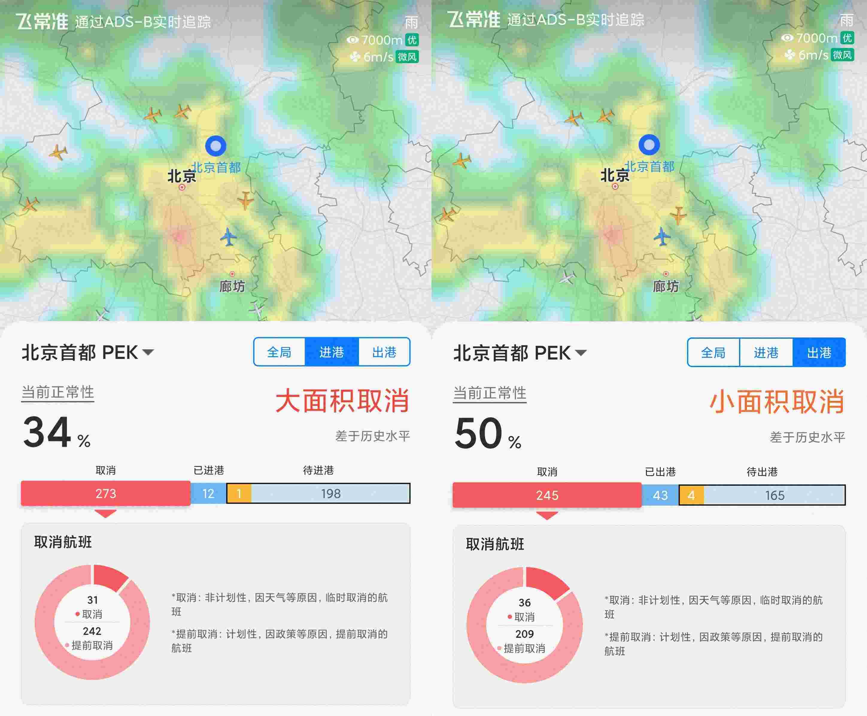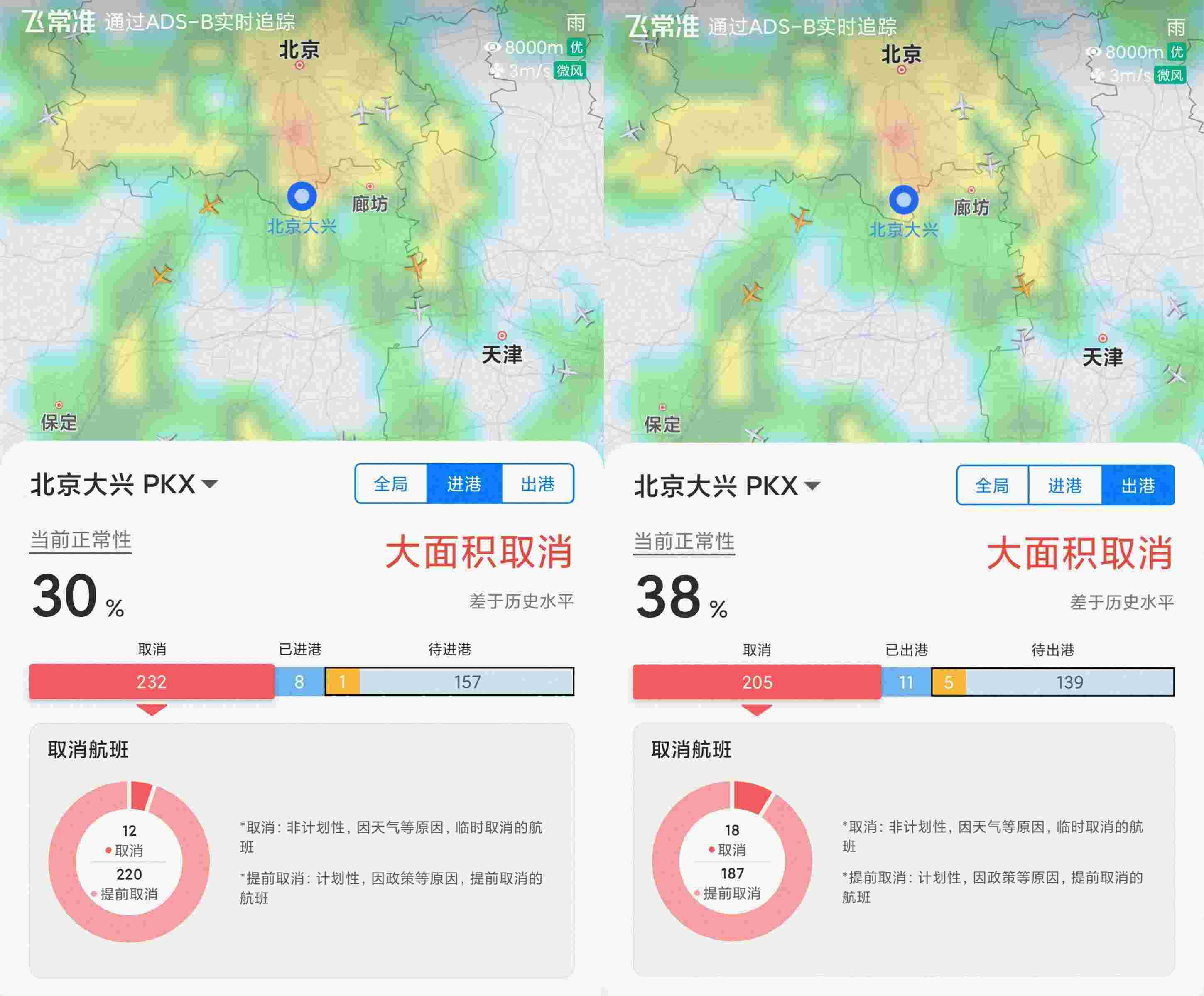 具体来看,首都机场部分进出港航班取消,其中,进港取消航班达273架次,出港取消航班达245架次;大兴机场航班大面积取消,其中,进港取消航班232架次,出港取消航班达205架次。