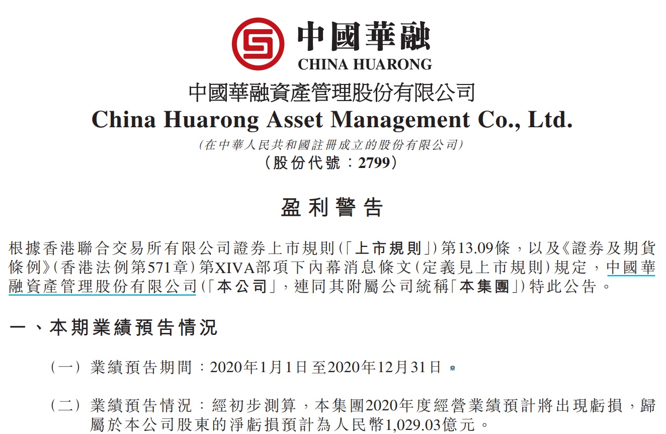18日晚间,中国华融资产管理股份有限公司(简称“中国华融”)发布盈利警告:经初步测算,2020年度经营业绩预计将出现亏损,归属于本公司股东的净亏损预计为人民币1029.03亿元。