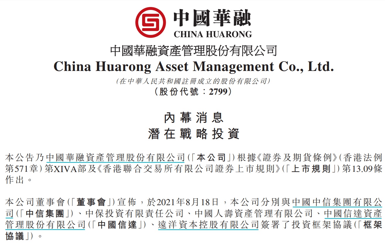 同日,中国华融发布公告称,公司董事会宣布,2021年8月18日,公司分别与中国中信集团有限公司、中保投资有限责任公司、中国人寿(601628,股吧)资产管理有限公司、中国信达资产管理股份有限公司、远洋资本控股有限公司签署了投资框架协议。