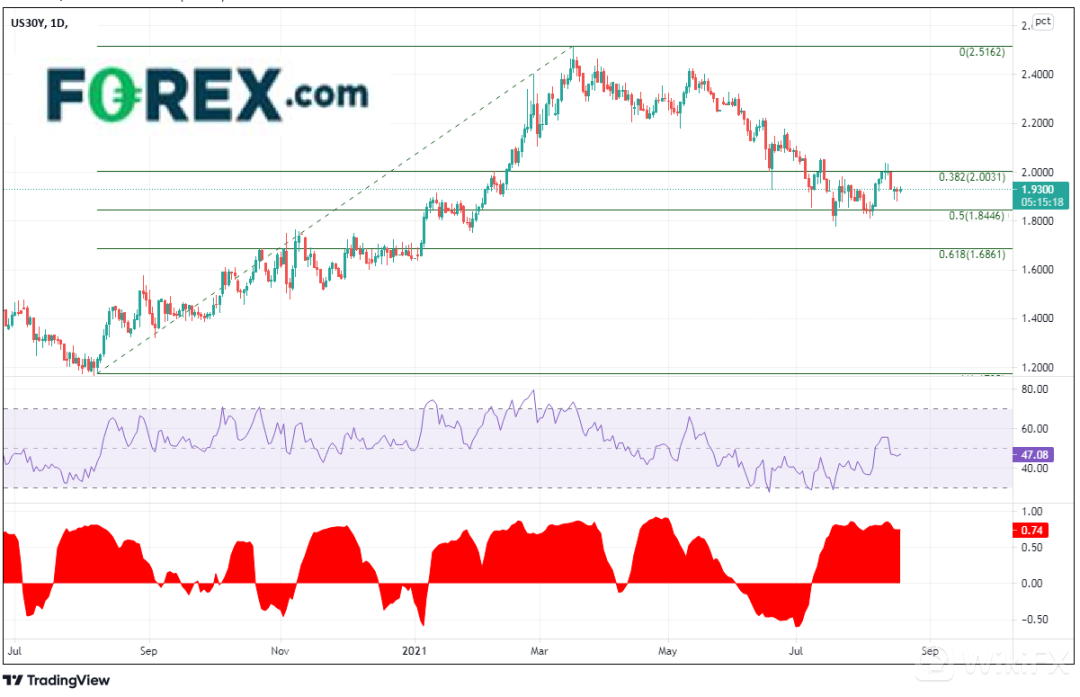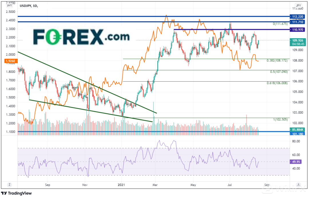 30年期债券收益率已自3月18日高点2.2156回落至7月20日的低点1.7800,但长期债券收益率设法守住了2020年8月7日低点到3021年3月18日高点行情的50%回档位构成的支撑,即1.8446附近。自从在7月20日最低到达1.7800以来,30年期债券收益率一直围绕着1.8110-1.9720区间起伏,等待美联储给出新的信号。请注意日图上30年期债券收益率和美元/日元之间的关联系数:目前报在+0.74。该数字6月初从负值回升,随后持续走高,最高到达+0.85,到了7月底趋于平缓。正如我们在以前文章所讨论的,债券收益率近期的走势可以帮助美元/日元交易者判断方向。收益率上涨,美元/日元随之走高,反之亦然。