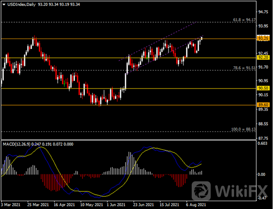日线图显示美元指数震荡上行,当前测试通道趋势线阻力和93.25区间阻力。从MACD来看,快慢线拐向上行,白色动能柱恢复放量。指数走势基本和动能柱的变化一致。