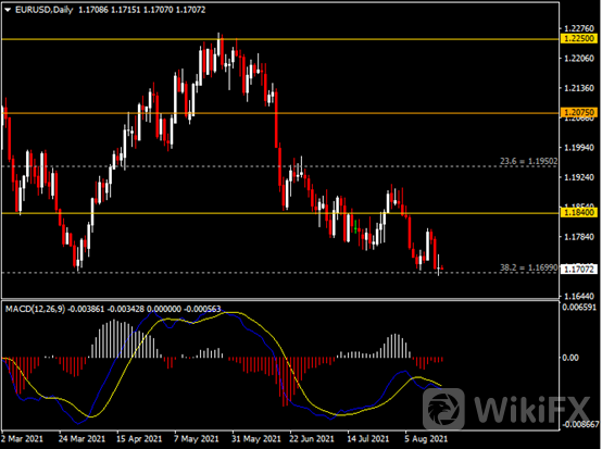 日线图显示欧元兑美元持稳于1.1700支撑。从MACD来看,快慢线窄幅向下运行,红色动能柱则温和收敛。汇价走势基本和动能柱的变化一致。