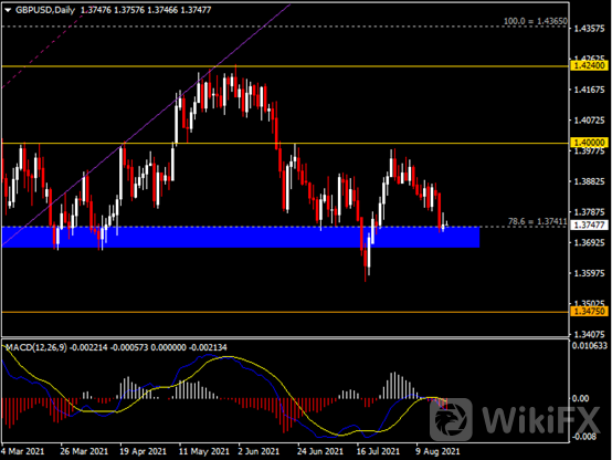 日线图显示英镑兑美元跌势暂缓,当前收于1.3740支撑。从MACD来看,快慢线向下运行,红色动能柱温和放量。汇价走势和动能柱的变化呈分歧。
