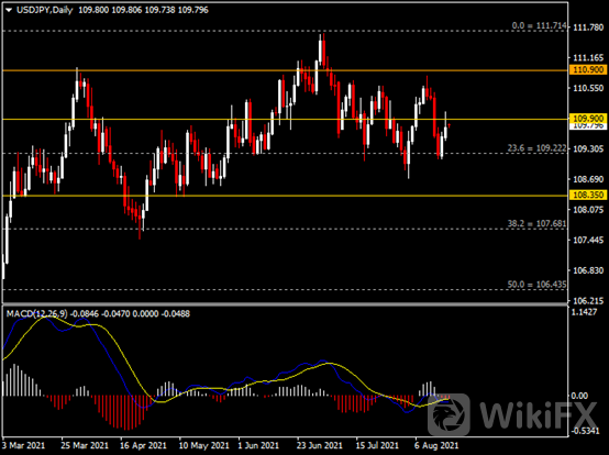 日线图显示美元兑日元反弹上涨,当前测试109.90阻力。从MACD来看,快慢线死叉依旧,红色动能柱呈平行。汇价走势和动能柱的变化稍显分歧。