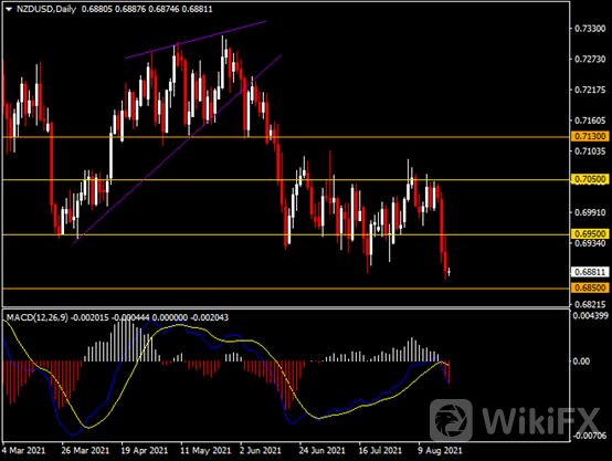 日线图显示纽元兑美元震荡下行,当前承压于0.6950阻力。从MACD来看,快慢线拐向下行,红色动能柱放量。汇价走势基本和动能柱的变化一致。