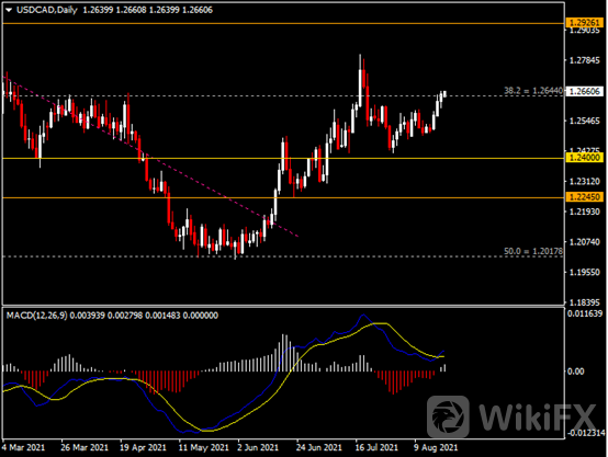 日线图显示美元兑加元持续走高,当前测试1.2640阻力。从MACD来看,快慢线金叉依旧,白色动能柱温和增量。汇价走势基本和动能柱的变化一致。