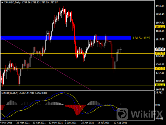 日线图显示金价持稳于1775支撑。从MACD来看,快慢线金叉依旧,白色动能柱温和放量。金价走势基本和动能柱的变化一致。