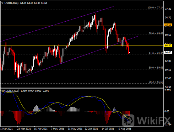 日线图显示油价空头承压,当前测试63.80支撑。从MACD来看,快慢线向下扩张,红色动能柱放量。油价走势基本和动能柱的变化一致。