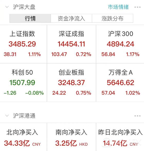 截至收盘,沪指涨1.11%报3485.29点,深成指涨0.72%报14454.11点,创业板指涨0.75%报3248.37点;两市合计成交11972亿元,北向资金净流入34.33亿元。