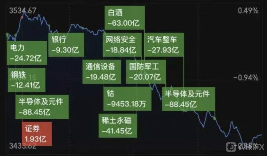 板块来看,半导体芯片、食品消费、医疗服务、CRO、白酒成为下跌主力军,受消息刺激,军工股异动,钴、抽水储能概念股逆势走强,券商、基建股稍显抗跌。其余板块杀跌严重,酿酒、半导体、医疗保健跌幅前列。
