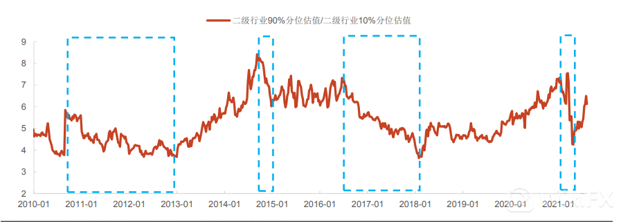 根据光大证券研报,市场风格分化与行业估值分化刻画的是同一现象,可以用行业估值分化程度来衡量市场风格分化程度。