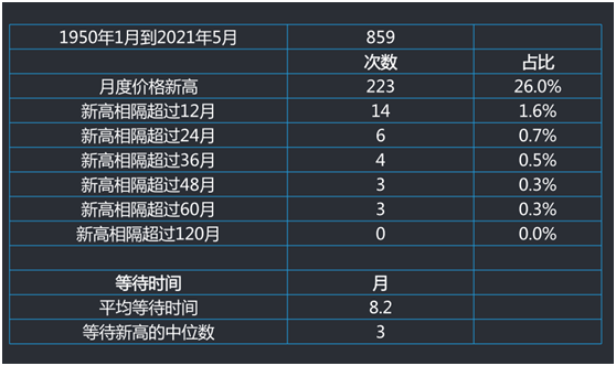 1950年到2021年间,70年、860个月中,月度创新高的月份占了223次。其中有14次间隔了12月,4次间隔超过24个月,3次超过48个月,3次超过60个月,0次超过120个月。中位数是3个月,平均等待是是8.2个月。