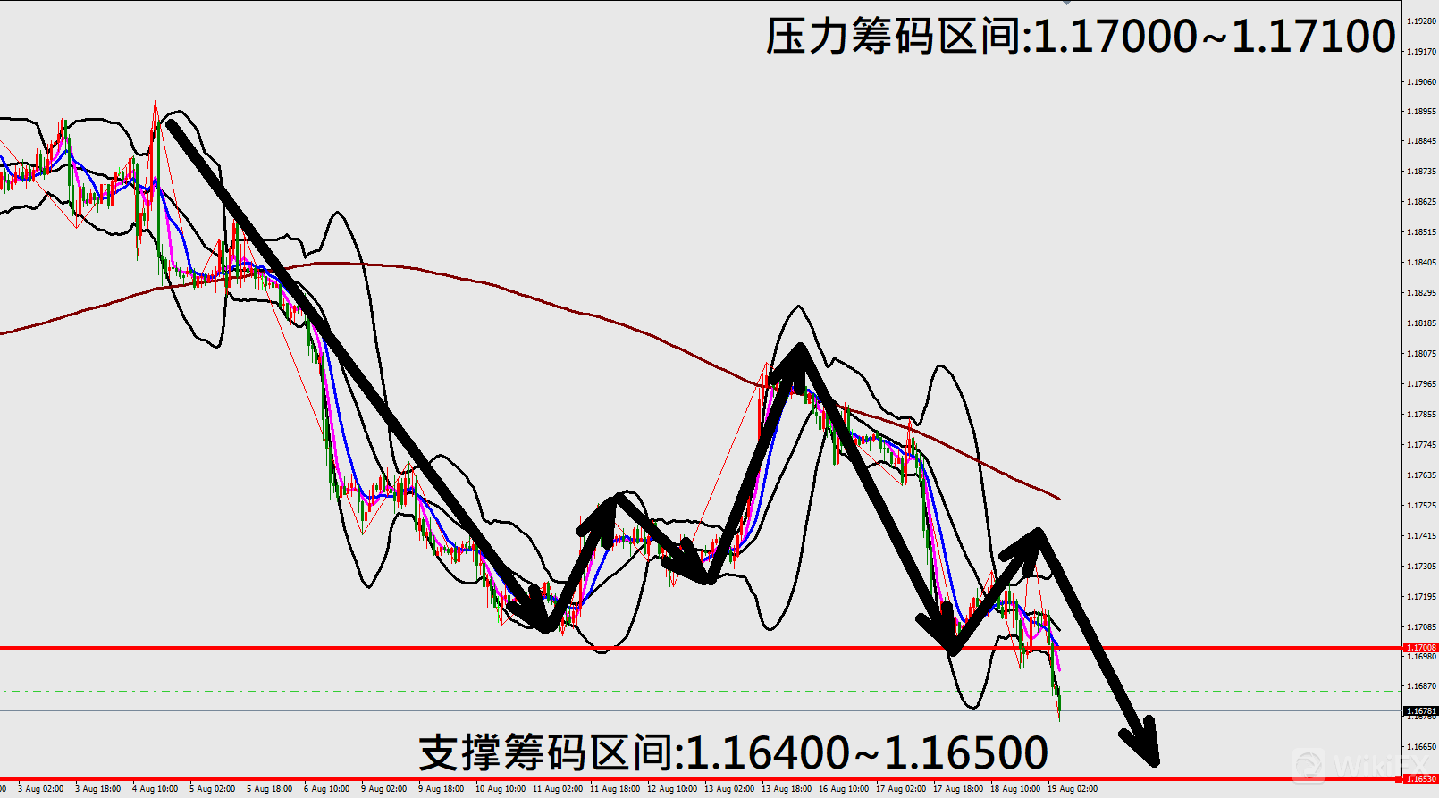 今日欧元/美元(8月19日)早盘在1.17088附近,从技术分析面切入,1小时级别观察走势架构符合昨日(18日)预测K棒再度出现重挫下跌行情,目前K棒落在布林通道中轨与下轨之间,同时开口朝下扩张,因此有机会持续向下修正。
