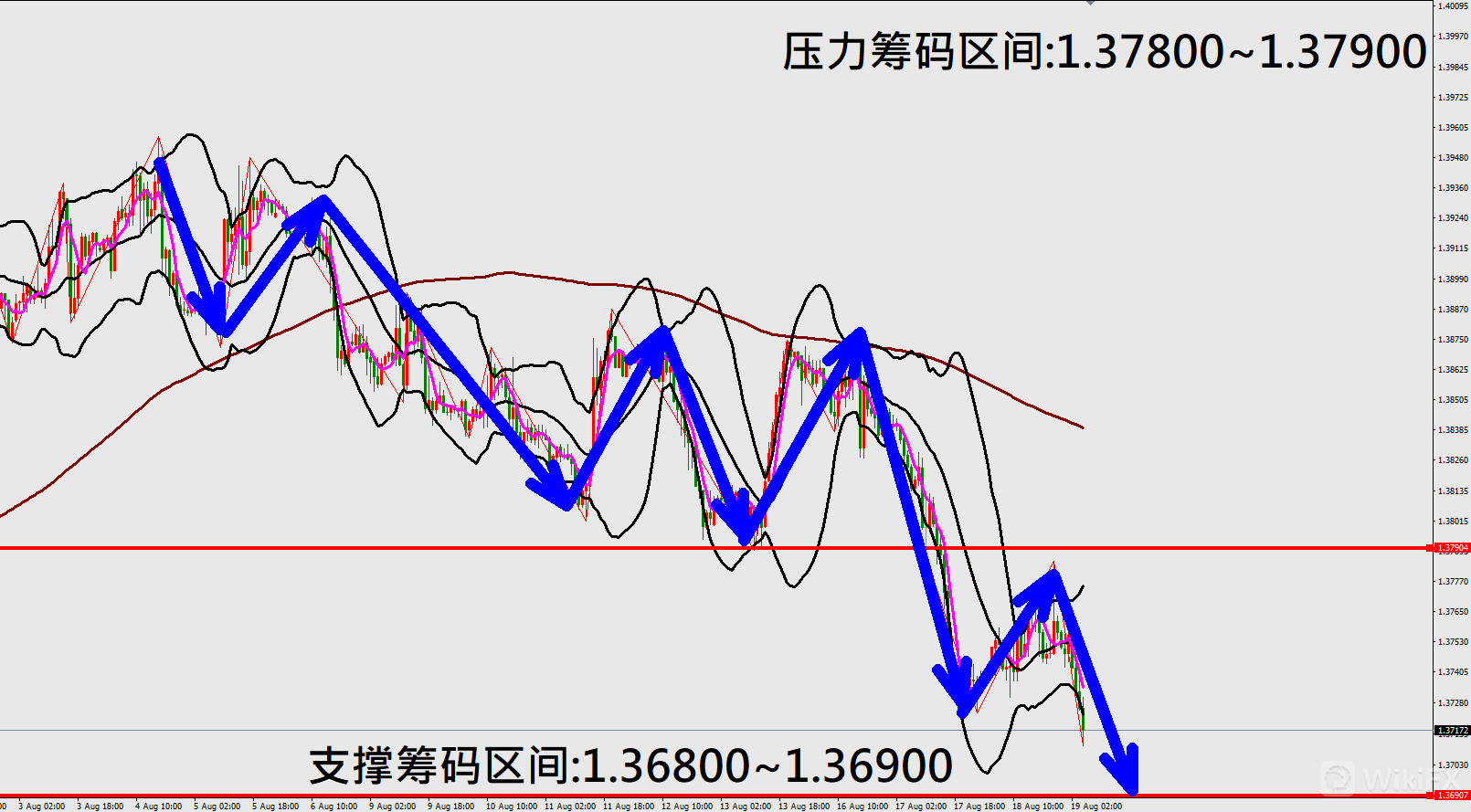 今日英镑/美元(8月19日)早盘在1.37480附近,从技术分析面切入,1小时线级别观察走势符合昨日(18日)K棒再度出现重挫下跌行情,目前K棒落在布林通道中轨与下轨之间,同时开口朝下扩张,因此有机会持续向下修正。