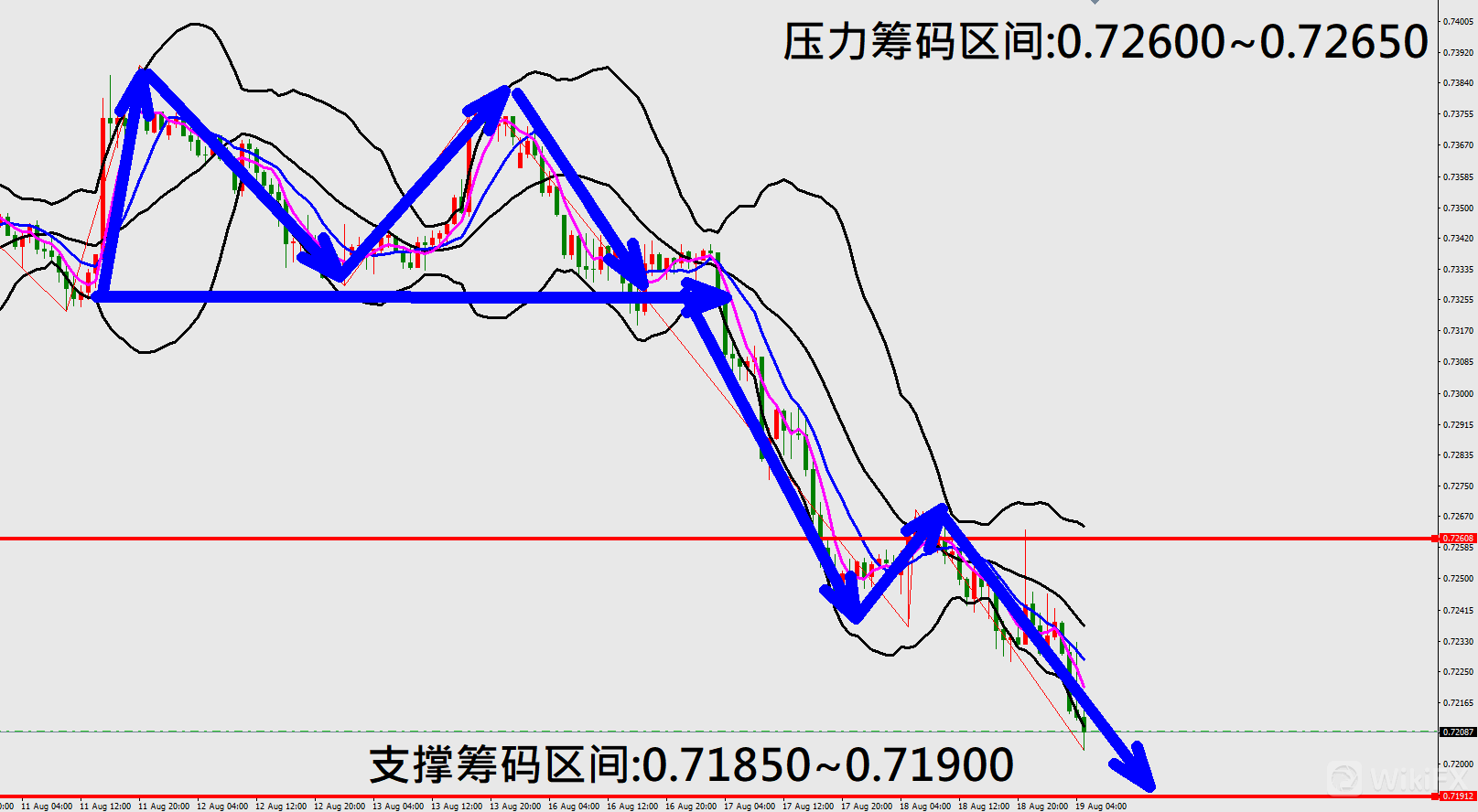 今日澳元/美元(8月19日)早盘在0.72342附近,从技术分析面切入,1小时线级别观察走势架构昨日(18日)K棒再度大幅下跌,目前K棒落在布林通道中轨与下轨之间,同时开口转折朝下,因此有机会持续向下修正。