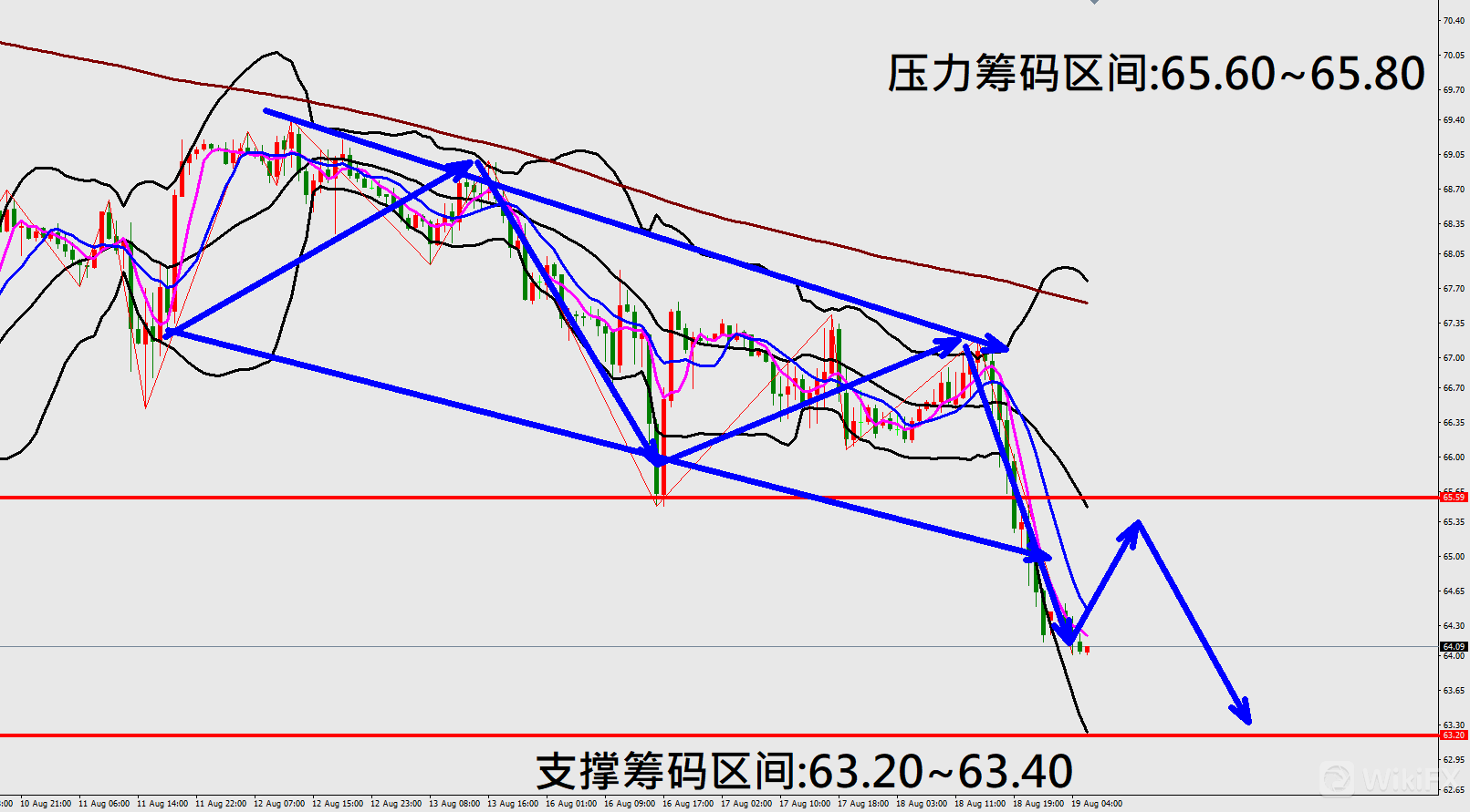 今日美国原油(8月19日)早盘在64.36附近,从技术分析面切入,1小时线级别观察走势架构符合昨日(18日)预测K棒出现大跌行情,目前K棒落在布林通道中轨与下轨之间,同时开口持续朝下扩张,因此有机会持续向下修正。
