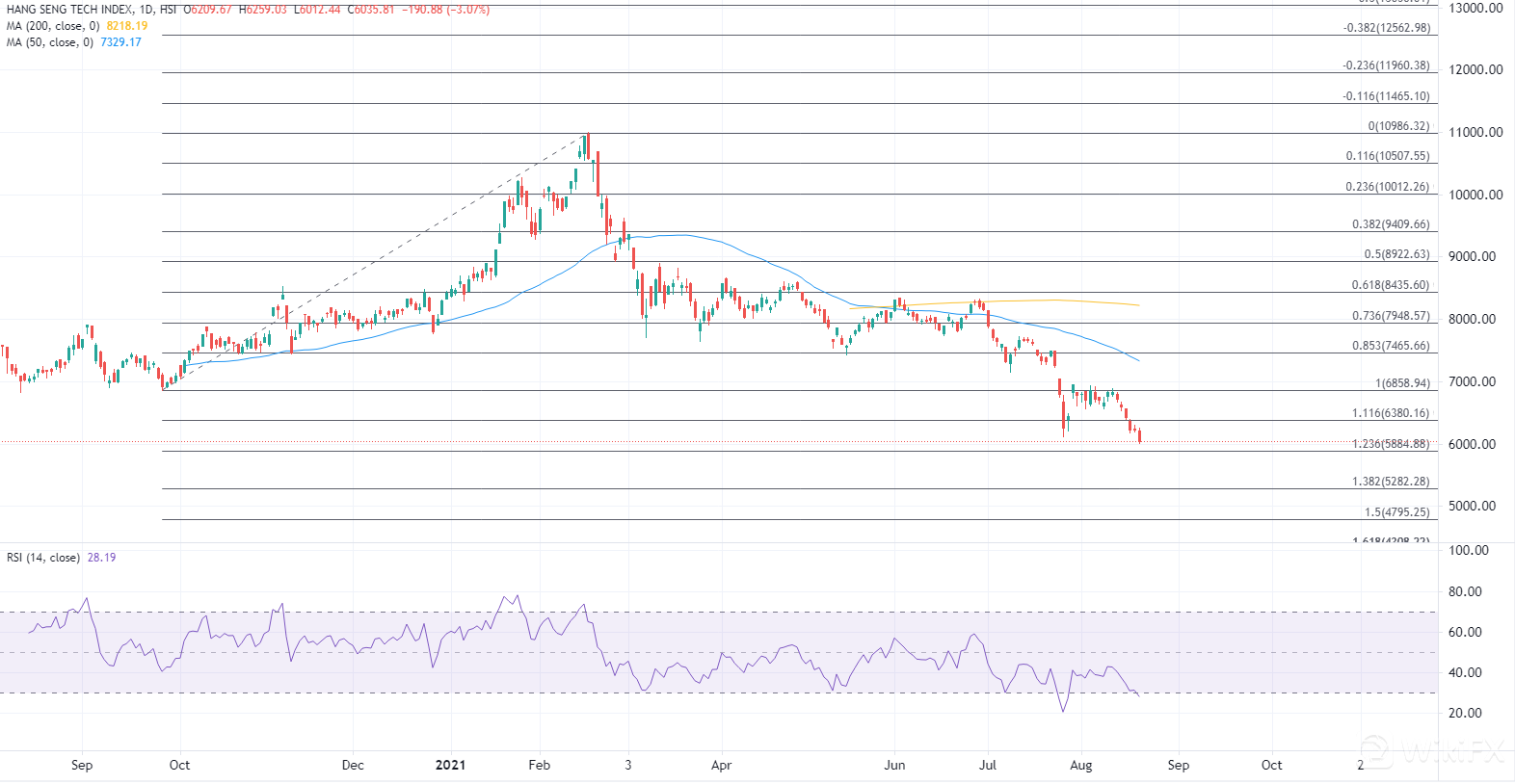 隔夜美联储纪要显示年底内削减购债的可能,美股连续两日收低,港股今早轻微低开后跌幅扩大至逾400点,科网股再度集体下行,恒生科技指数创推出以来的新低,已经是六日连跌,为近一年以来的最长连跌,盘中逼近6000点关口。阿里巴巴股价创在港上市的新低,午后跌近6%,美团跌逾7%,快手股价跌5%继续寻底。