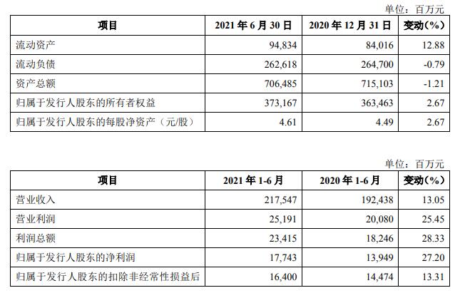 《公告书》显示,截至2021年6月30日,中国电信资产总额为7064.85亿元,较2020年末减少1.21%;归属于发行人股东的所有者权益为3731.67亿元,较2020年末增长2.67%。2021年1-6月,公司实现营业收入2175.47亿元,较去年同期增长13.05%;实现归属于发行人股东的净利润177.43亿元,较去年同期增长27.20%;实现扣除非经常性损益后归属于发行人股东的净利润164.00亿元,较去年同期增长13.31%。