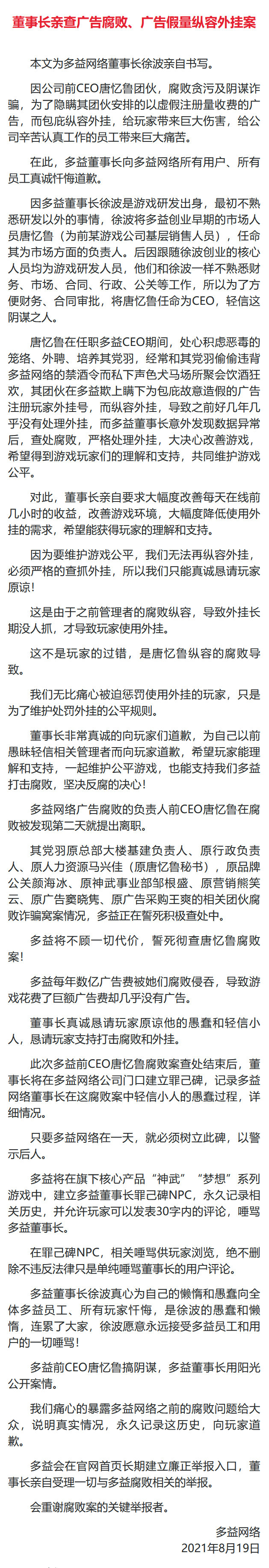 在题为《董事长亲查广告腐败、广告假量纵容外挂案》的文中,徐波表示,因公司前CEO唐忆鲁团伙,腐败贪污及阴谋诈骗,为了隐瞒其团伙安排的以虚假注册量收费的广告,而包庇纵容外挂,给玩家带来巨大伤害,给公司辛苦认真工作的员工带来巨大痛苦。