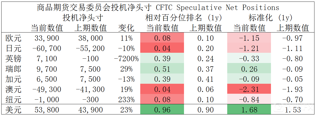 CFTC资金流数据显示,澳元、日元空头处于极值,因此,预计短期随着资金流入并支持其回涨,另外,美元多头也处于极值。