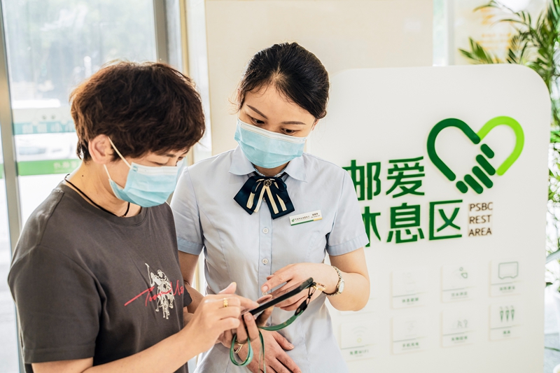 邮储银行湖州市分行把“我为群众办实事”作为党史学习教育重要内容,立足实际,让有温度的金融服务走进群众。该分行在辖内网点添设“邮爱休息区”,提供便民惠民服务、金融知识普及服务、关爱服务等,赢得了客户的好评。图为该行理财经理在指导客户使用手机银行办理业务,减少窗口等待时间。