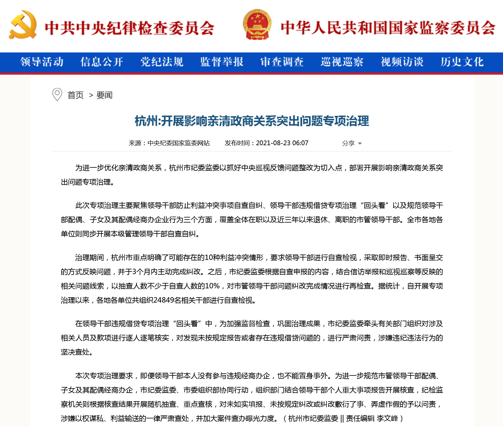 据中央纪委国家监委网站,为进一步优化亲清政商关系,杭州市纪委监委以抓好中央巡视反馈问题整改为切入点,部署开展影响亲清政商关系突出问题专项治理。主要聚焦领导干部防止利益冲突事项自查自纠、领导干部违规借贷专项治理“回头看”以及规范领导干部配偶、子女及其配偶经商办企业行为三个方面;即便领导干部本人没有参与违规经商办企,也不能置身事外。