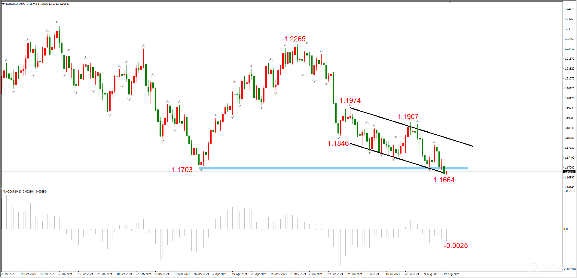 结构上,中长期支撑位1.1703被有效突破,后市看跌,且跌幅较大。需要关注通道线下轨支撑作用,有可能出现反弹,但概率较低,因为当前空头动能较强。