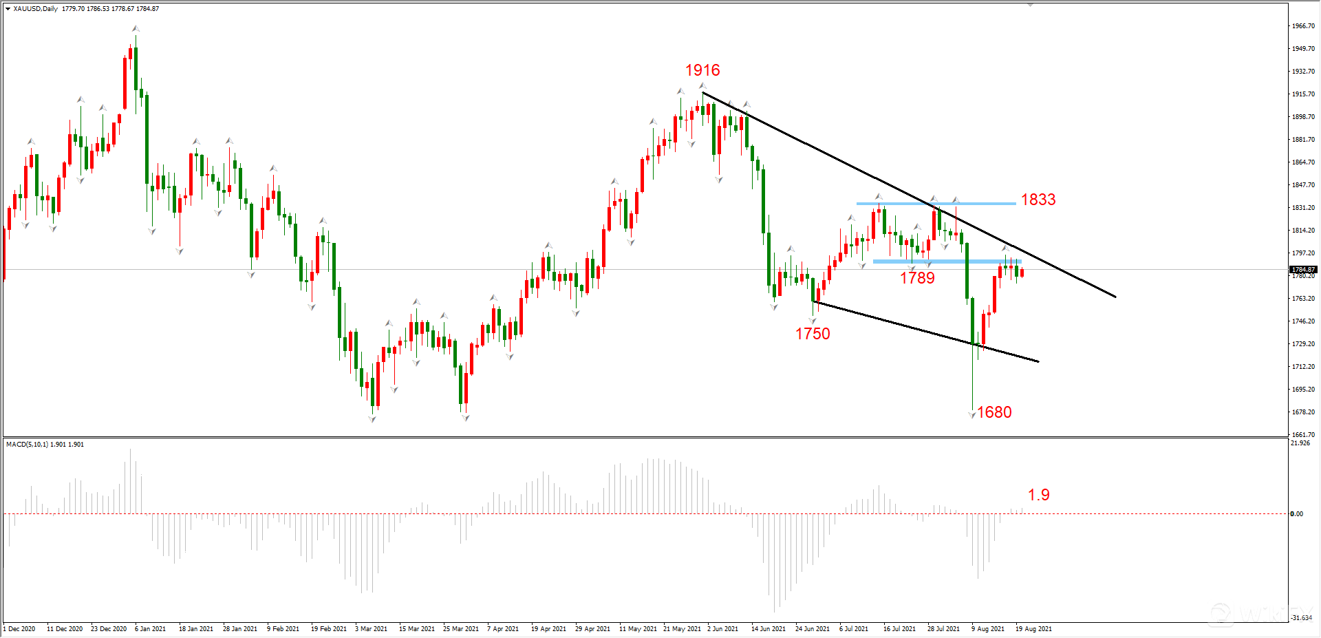 结构上,趋势依旧为空头,目前处于反弹波段,阻力位在1789和下降趋势线位置。近期连续收出十字星形态,代表多空博弈剧烈,且两者力量均衡。后市存在两种走法,一种是看窄幅震荡;另一种是看大幅下跌。后者出现的概率更高。因为宏观面因素确实不支持黄金高位震荡或上涨。