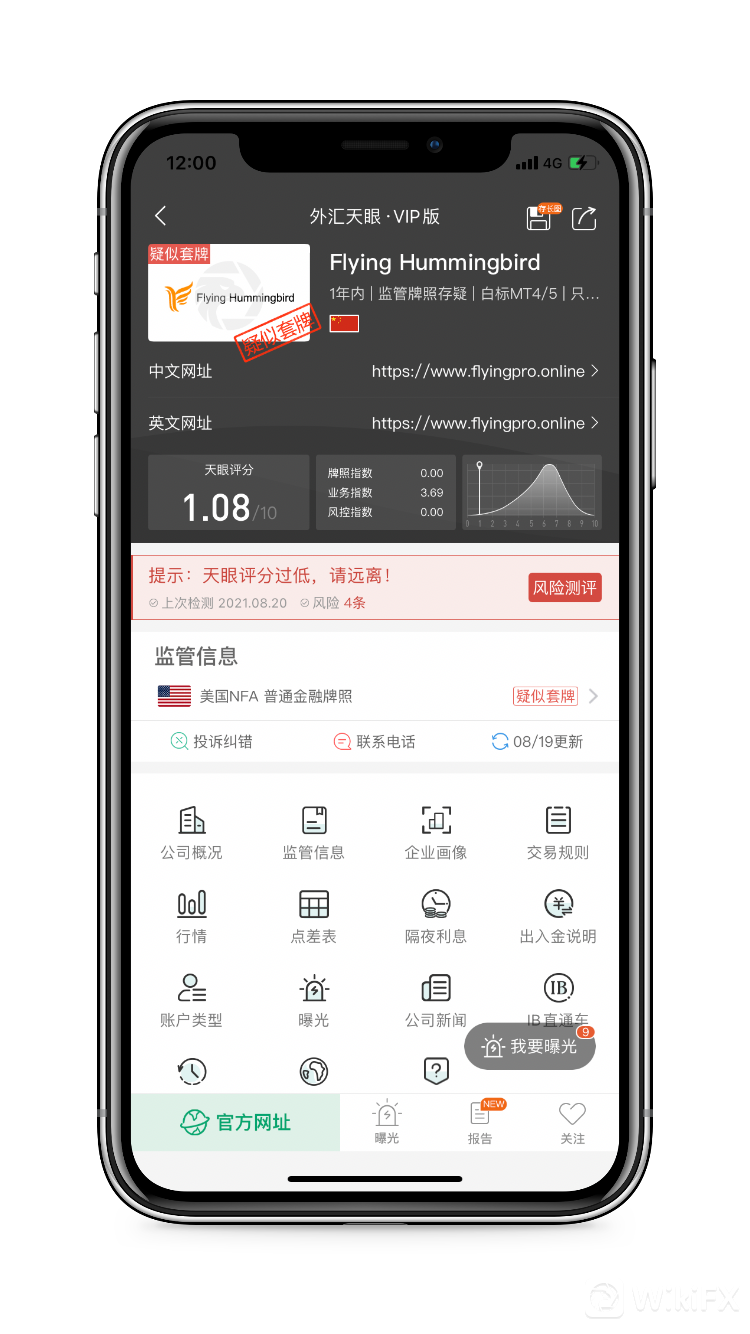 在外汇天眼上查询Flying Hummingbird,天眼评分1.08分,宣称持有的美国NFA普通金融牌照疑似套牌,当前没有任何其他实际有效的监管牌照,存在巨大风险。
