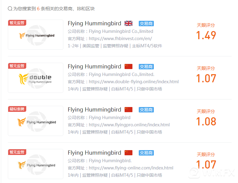 并且在外汇天眼可以查询到4家与Flying Hummingbird同名的平台,均为低分无监管的黑平台,根据公司的名称和创建时间可以断定都是由一个诈骗团伙搞出来的。