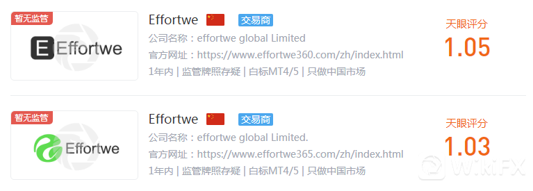 在外汇天眼上查询Effortwe,天眼评分1.03分,当前暂无查证到任何实际有效的监管信息,存在巨大风险,建议投资者们远离。