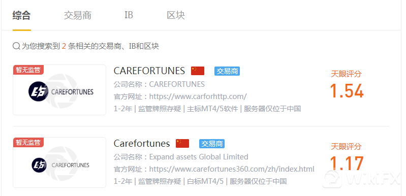 在外汇天眼上查询CAREFORTUNES,天眼评分1.54分,拥有2个不同的官网网址,以及网站均无法打开。