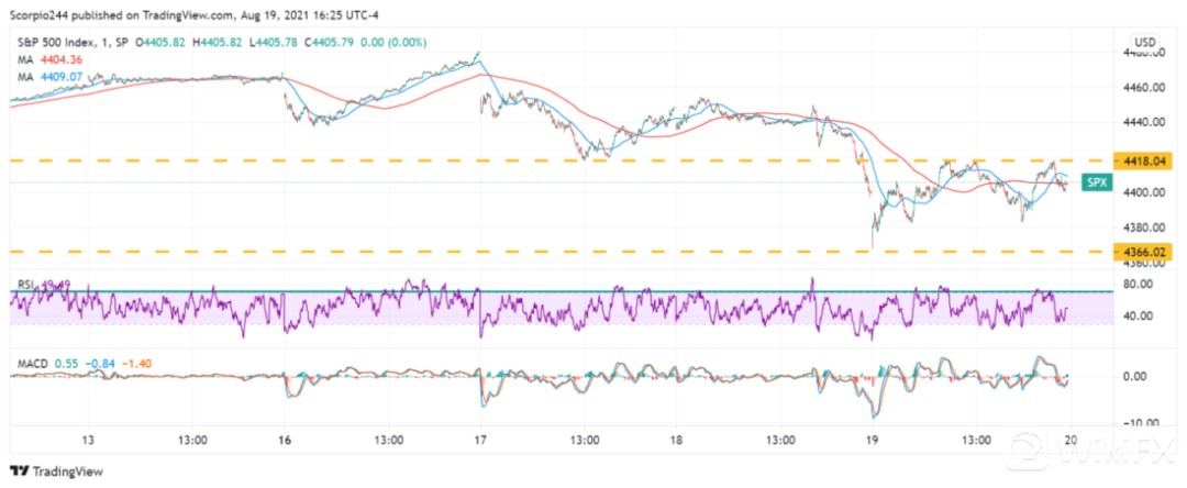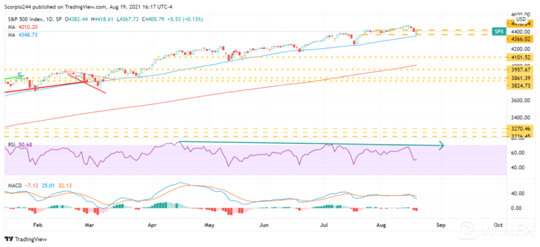 标普500指数今天三次试图升至4420点上方而未果。如果想要在明天看到标普500指数上涨,则需要在开盘时跃升至该水平线上方;我认为会这样;否则,指数会陷入挣扎中。