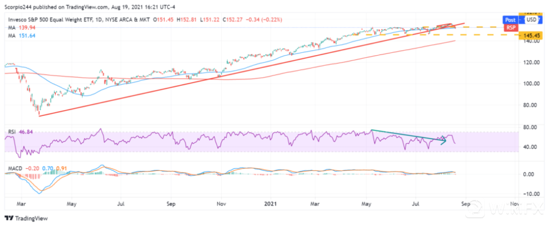 事实证明观望是正确的,标普500等权指数基金在本周下跌近2%,跌破152.50美元处的支撑线和2020年上升趋势线。另外,标普500等权指数基金的MACD目前也转头向下。