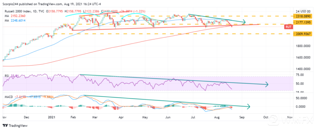 罗素2000指数明日很容易出现上周,如果未能上涨,则相对强弱指数RSI可能会创新低,如果你希望罗素2000指数触底的话,这是你最不想看到的情况。