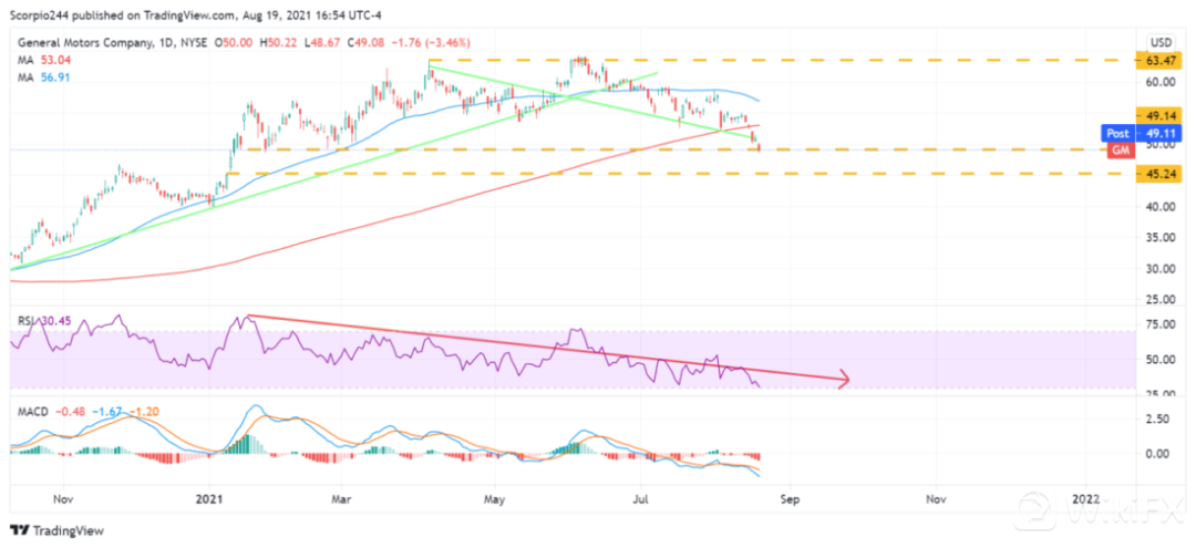 通用汽车面临的困境与福特汽车类似,如果通用汽车的股价跌破49美元的支撑线,则该公司股票下一个可能止住跌势的位置在45.25美元附近。