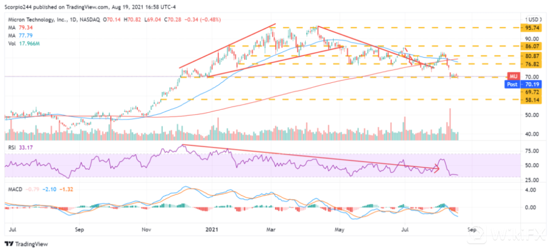 随着美光科技股票跌破70美元的支撑线,汹涌的抛售即将出现。美光科技股价未来可能大跌,可能回落至58美元。