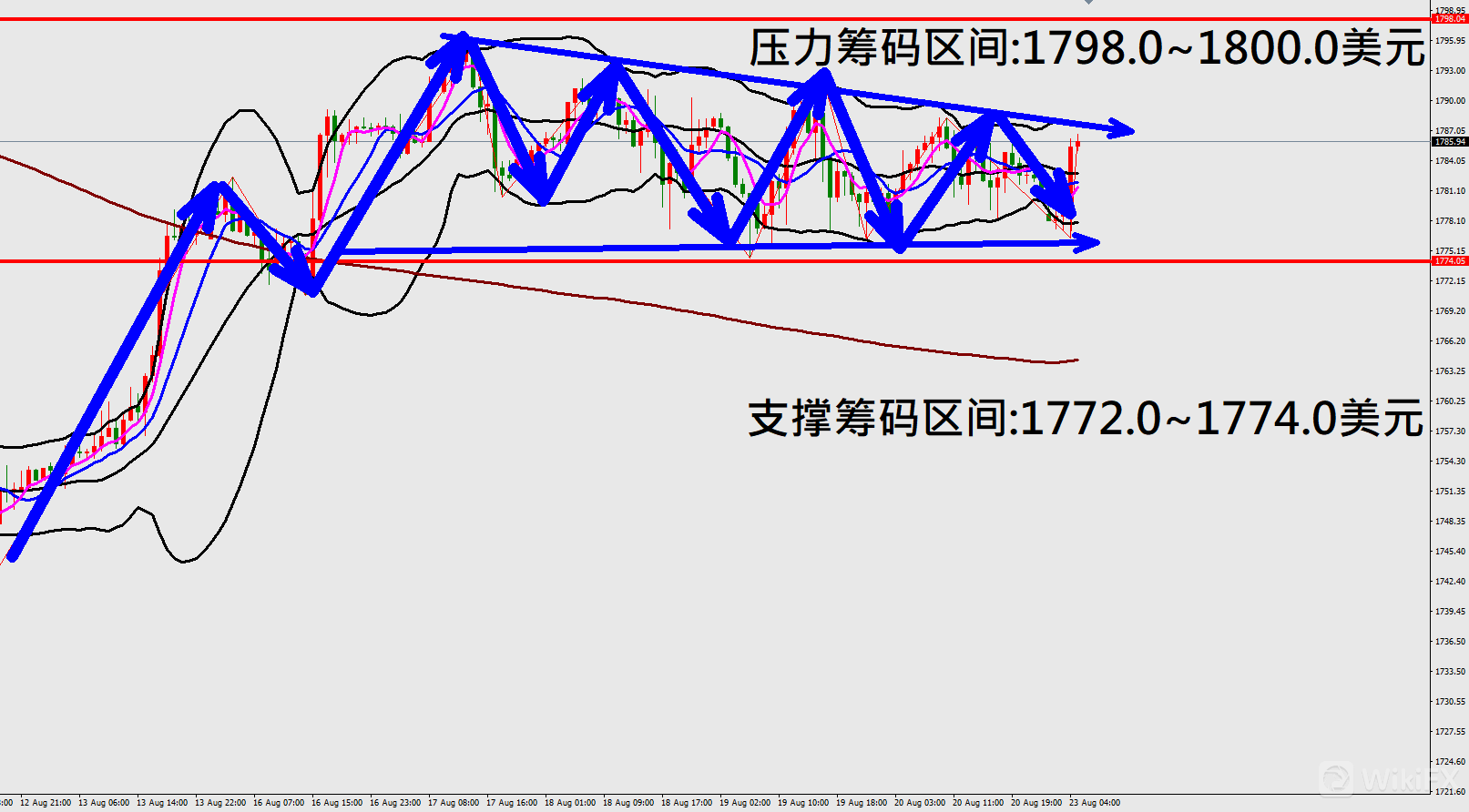 今日黄金(8月23日)早盘在1778.7美元/盎司附近,从技术分析面切入1小时级别观察走势架构上周五(20日)K棒盘中高点狭幅震荡,目前K棒落在布林通道中轨附近震荡,同时开口转折朝上,因此有机会出现反弹上涨行情。