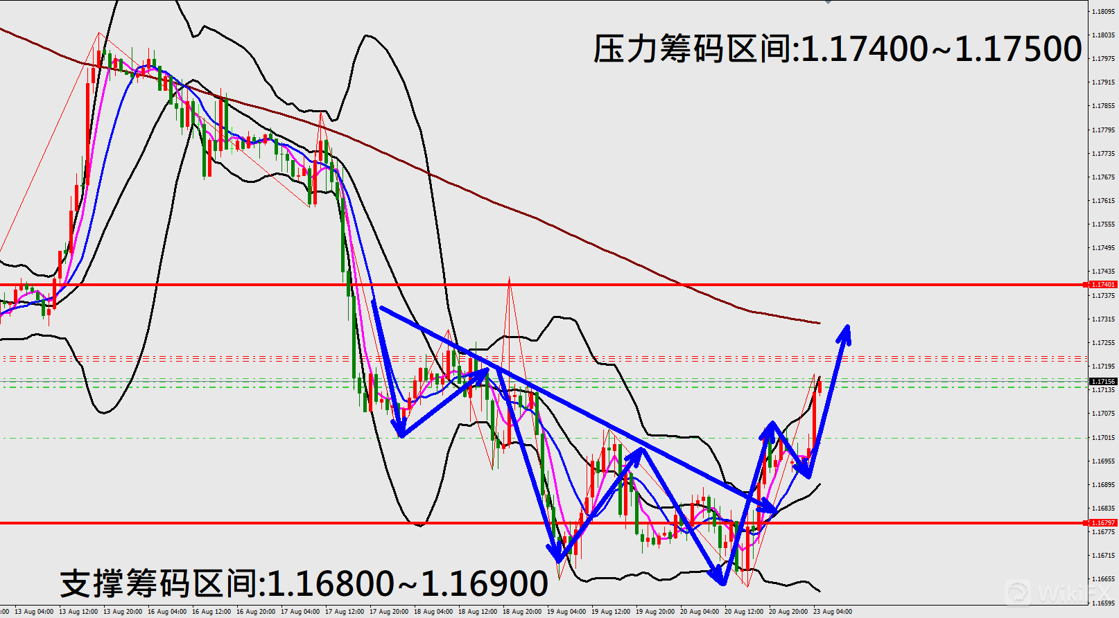 今日欧元/美元(8月23日)早盘在1.16950附近,从技术分析面切入,1小时级别观察走势架构符合上周五(20日)预测K棒出现触底反弹上涨行情,目前K棒落在布林通道中轨与上轨之间,同时开口转折朝上,因此有机会持续反弹上涨。