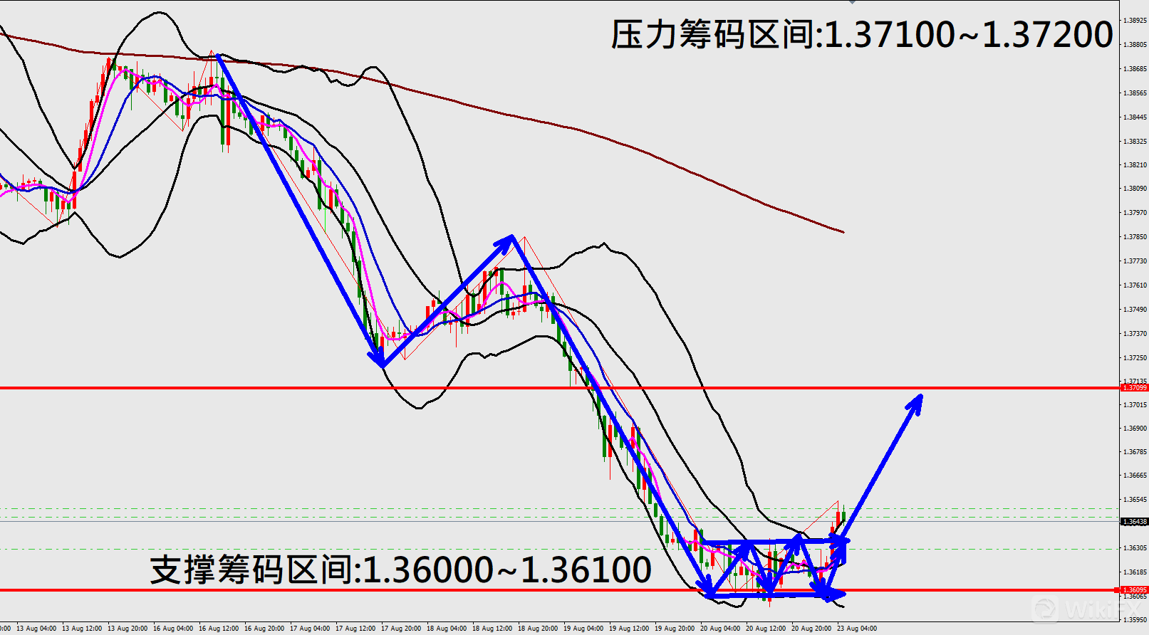 今日英镑/美元(8月23日)早盘在1.36113附近,从技术分析面切入,1小时线级别观察走势上周五(20日)K棒出现触底反弹上涨行情,目前K棒落在布林通道中轨与上轨之间,同时开口转折朝上,因此有机会持续反弹上涨。