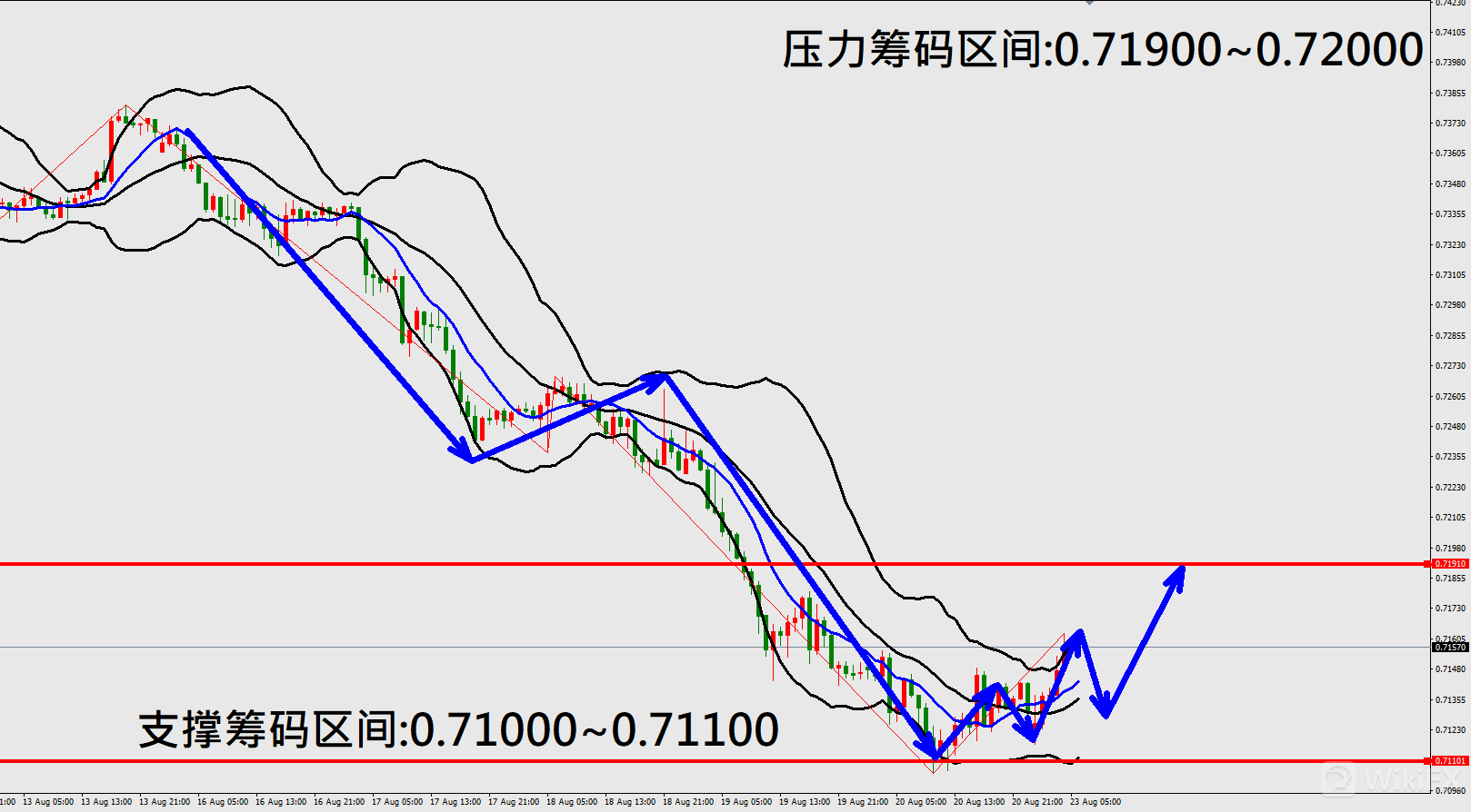 今日澳元/美元(8月23日)早盘在0.71254附近,从技术分析面切入,1小时线级别观察走势架构上周五(20日)K棒出现触底反弹上涨行情,目前K棒落在布林通道中轨与上轨之间,同时开口转折朝上,因此有机会持续反弹上涨。