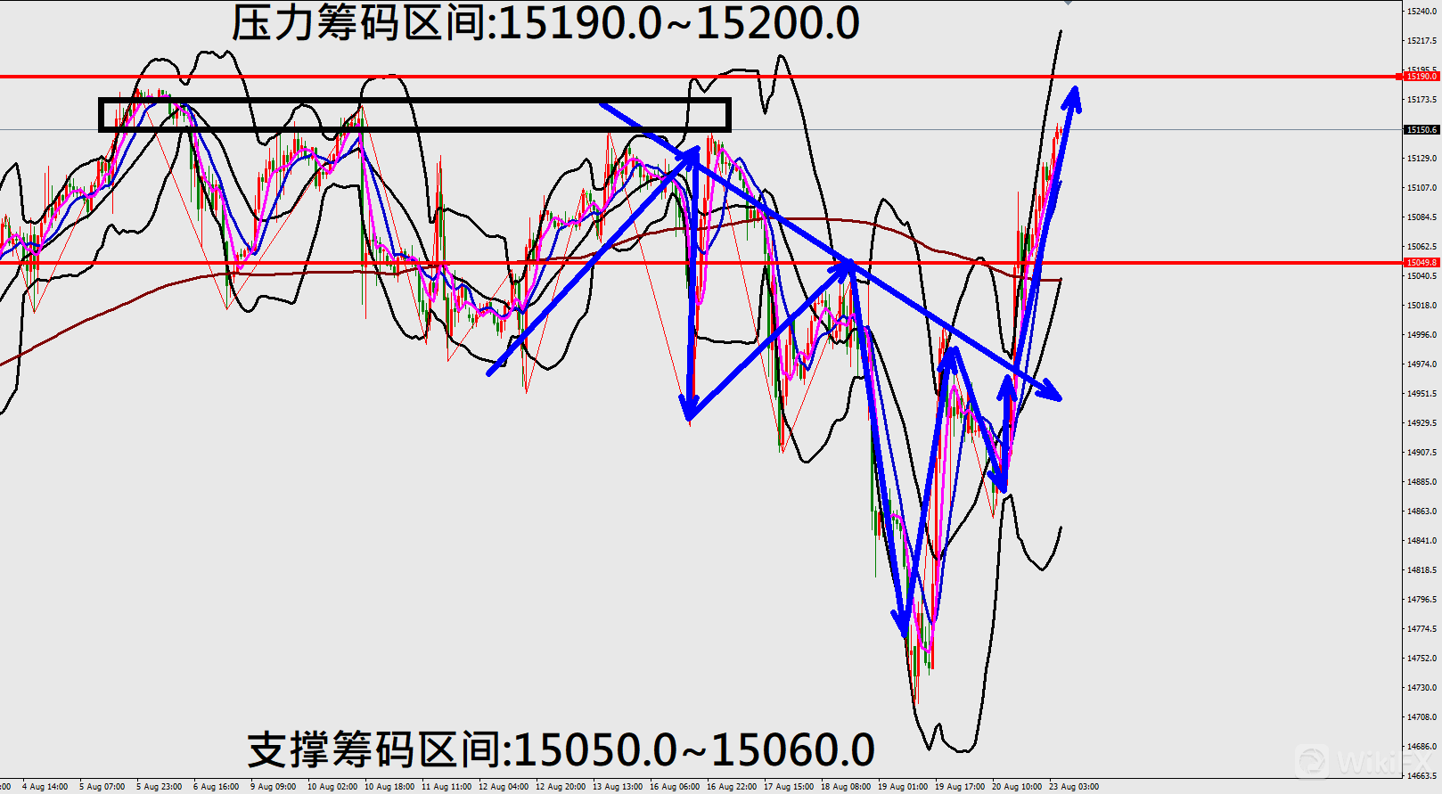 今日纳指(8月23日)早盘在15091.2附近,从技术分析面切入,1小时线级别观察走势架构符合上周五(20日)预测K棒出现触底反弹上涨行情,目前K棒落在布林通道中轨与上轨之间,同时开口转折朝上,因此有机会持续反弹上涨。