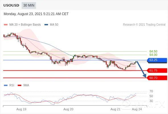 交易策略:在63.25之下,看跌,目标价位为61.75,然后为60.70。