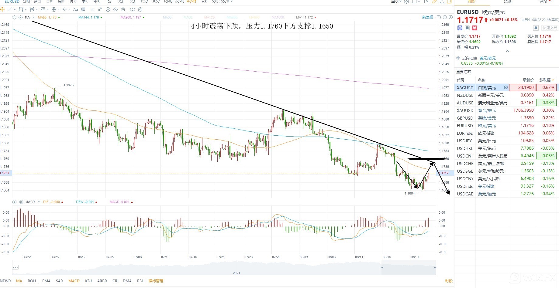 欧美新低之后再次反弹,短期还不能确认是否底部已经到位,因美元指数目前在加速上涨的趋势过程之中,且突破之后目前回踩确认突破是否有效,关注本周的全球央行会议为主,技术层面欧美1.1650成为短期支撑,反弹4小时下降趋势线压力1.1760不破,则维持震荡下行为主,趋势没有改变之前以震荡下跌对待