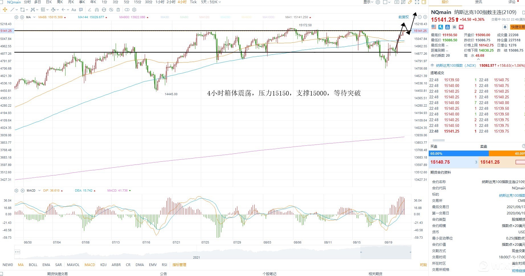 纳斯达克指数再次上涨,目前依然在箱体之内,不过在箱体上沿有突破的迹象,且基本面上风险偏好上行,推动风险资产走强,技术层面上只有站稳15150才能够进一步向上,考虑到短期美元冲高回落,不排除指数再次向上的可能性,日内重要支撑15000不破则维持震荡上行,等待突破为主
