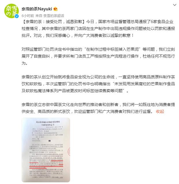 24日凌晨,微博@奈雪的茶Nayuki发文称“接受处罚,诚恳致歉”。