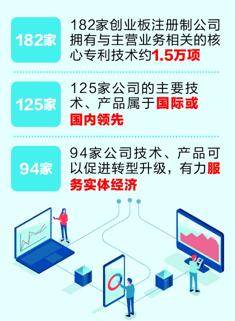 聚焦“三创”“四新”板块定位,上市公司不断践行创新驱动发展,表现出了更好的成长能力、盈利能力,并保持了较强的创新属性。182家创业板注册制公司拥有与主营业务相关的核心专利技术约1.5万项,125家公司的主要技术、产品属于国际或国内领先,94家公司技术、产品可以促进转型升级,有力服务实体经济。