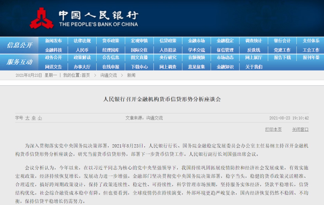 8月23日,人民银行行长、国务院金融稳定发展委员会办公室主任易纲主持召开金融机构货币信贷形势分析座谈会,研究当前货币信贷形势,部署下一步货币信贷工作。